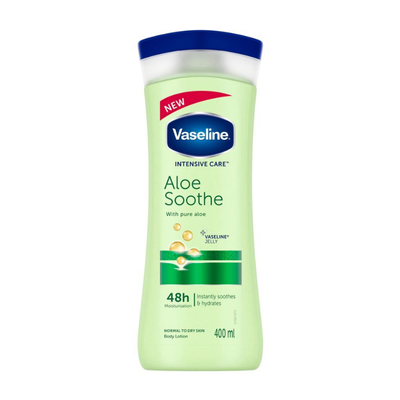 xVaseline Intensive Care Aloe Soothe Lotion is a 400-ml bottle of lotion designed to moisturize and soothe dry, irritated skin. Here's a breakdown of its key features: