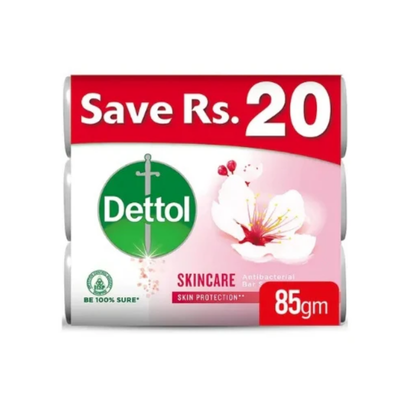 xThe Dettol Soap 85gm Skincare Bundle Pack 3PCS is a set of three Dettol skincare bars weighing 85 grams each. Dettol is known for its germ-killing properties, and this particular soap is designed to be gentle on your skin.